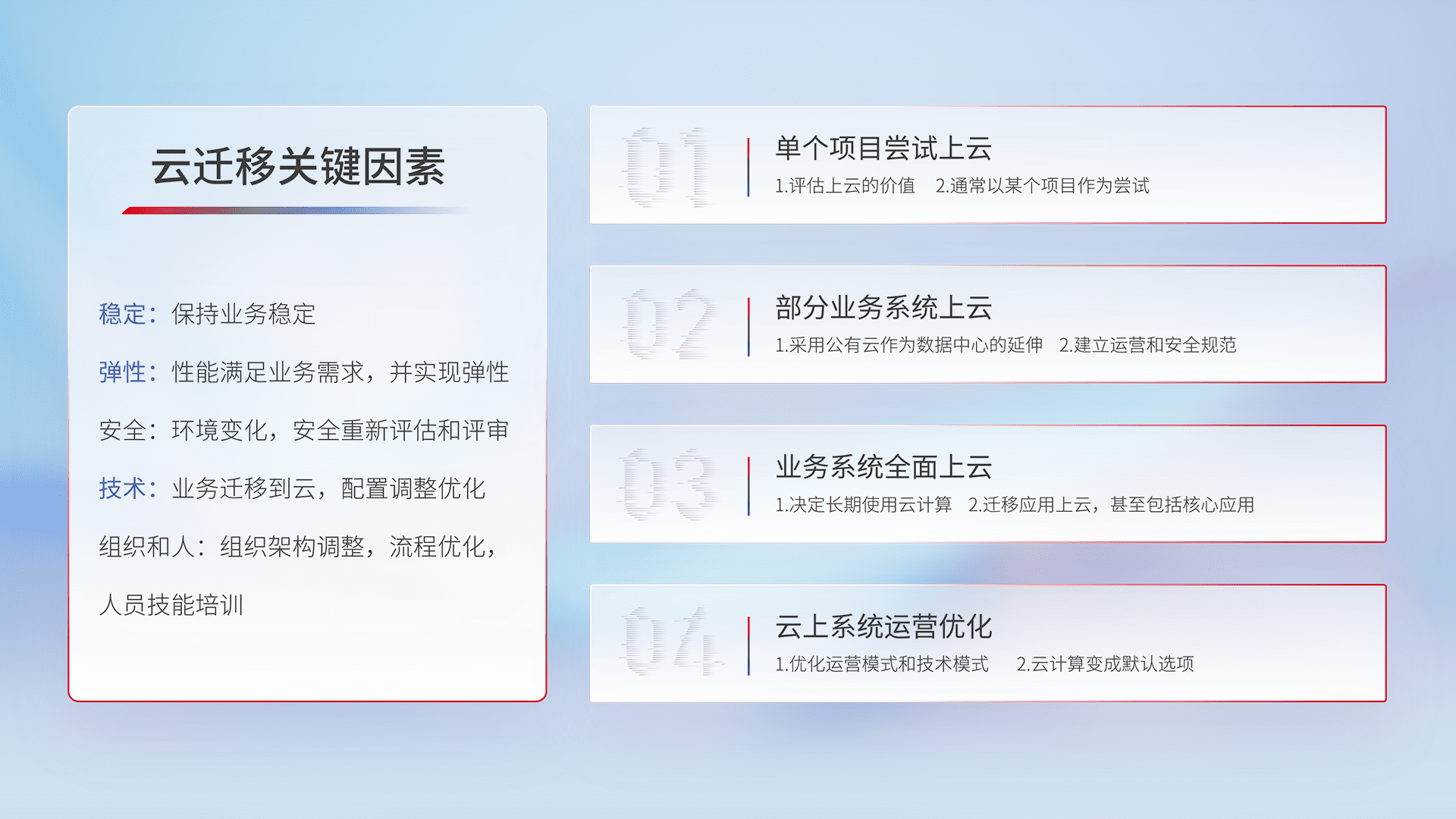 结合实际业务,,,,从规划设计、、、云平台选型、、、、云原生改造、、、数据迁移、、、集成交付,,迁移全过程为客户识别最佳上云路径,,做好风险识别管理,,设计网络架构、、身份权限、、、安全审计合规、、、、操作审计、、、日志审计、、、监控告警策略、、、、多站点容灾设计等,,,对云上基础设施进行整体规划,,提升IT治理水平,,,以满足弹性、、高可用、、、高性能的需求。。。
